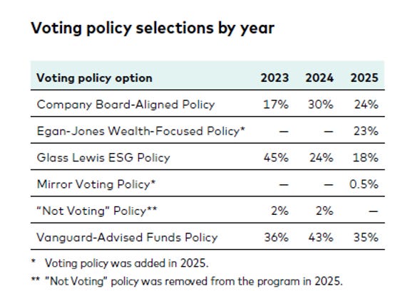 • Mirror-voting : vote conformément au vote moyen des autres investisseurs. Après la politique “no vote”, heureusement supprimée par Vanguard, c’est le deuxième politique la plus indigente. Elle n’a quasiment pas été utilisée lors de la saison 2025 (voir ci-dessous) et je suppose que Vanguard va la faire passer à la trappe.